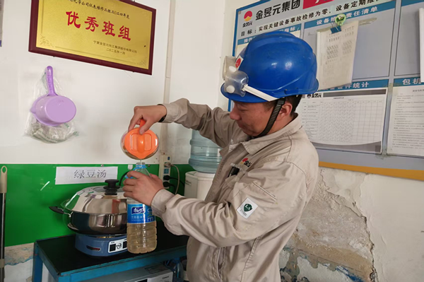 為了讓清涼不間斷供應(yīng),能源化學(xué)公司還在各個裝置的維修室設(shè)立了固定的“清涼補給站”,配備保溫桶、一次性水杯,安排專人負責(zé)續(xù)水。同時,根據(jù)維修人員的工作時間靈活調(diào)整供應(yīng)時段,確保大家在作業(yè)間隙都能隨時喝上清涼飲品。此外,各個裝置還通過班前會、微信群等渠道,向維修人員普及防暑降溫知識,提醒大家合理安排作業(yè)時間,注意勞逸結(jié)合。