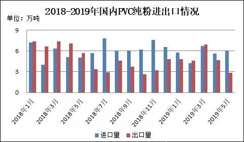 圖5 2018-2019年國內(nèi)PVC純粉進(jìn)出口情況