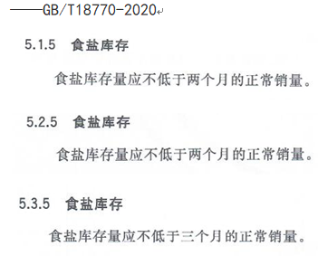 GB/T18770-2020標(biāo)準(zhǔn)提出A、AA級企業(yè)“應(yīng)不低于”二個月正常銷量儲備,AAA級企業(yè)“應(yīng)不低于”三個月正常銷量儲備,井礦鹽區(qū)生產(chǎn)精制鹽按市場需要產(chǎn)出,不象海湖鹽區(qū)產(chǎn)場集中生產(chǎn)堆垛,在目前市場競爭條件下難以實(shí)現(xiàn),能夠達(dá)到一個月正常銷量食鹽儲備都很不錯了。