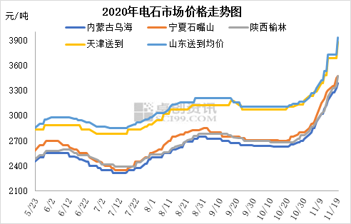 整體市場描述:上周五至今電石價格繼續(xù)快速上漲,各地采購價連續(xù)上調(diào)300-400元/噸,電石出廠價上調(diào)200元/噸左右,且烏海及周邊貿(mào)易出廠價推出了明日繼續(xù)上漲100元/噸計劃。至此,10月下旬至今,電石價格已連續(xù)上調(diào)了700-800元/噸,達到2011年9月以來的最高水平。本周電石價格仍在繼續(xù)上調(diào),主要仍因供需失衡,貨源緊俏推動。內(nèi)蒙古地區(qū)電石仍頻繁有不同程度的限電現(xiàn)象,產(chǎn)量不足,寧夏石嘴山地區(qū)受重污染天氣影響,本周后期有電石爐降負荷現(xiàn)象,外加其它復(fù)工電石爐恢復(fù)緩慢,電石增量較為有限;但PVC價格仍在連續(xù)上漲,前期停車PVC企業(yè)也有復(fù)產(chǎn),整體開工高位,部分甚至超負荷運行,外加冬季來臨前對電石也有補庫需求,整體需求維持高位,綜合導(dǎo)致電石貨源持續(xù)緊張,價格得以連續(xù)上揚。