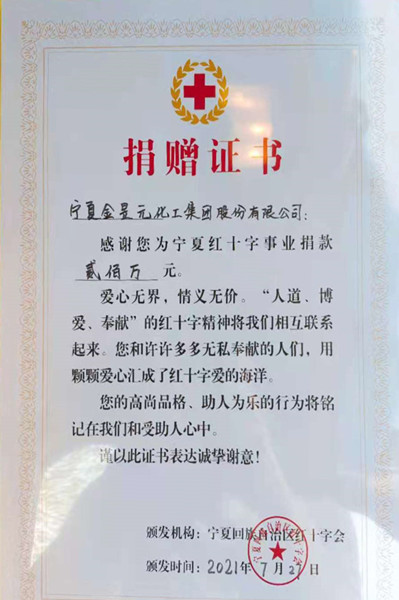 洪災(zāi)無情,人間有愛。7月28日,寧夏金昱元化工集團(tuán)股份有限公司委托寧夏紅十字會(huì)向河南災(zāi)區(qū)捐助二百萬元,馳援河南受災(zāi)地區(qū),表達(dá)對(duì)災(zāi)區(qū)人民的深切問候。