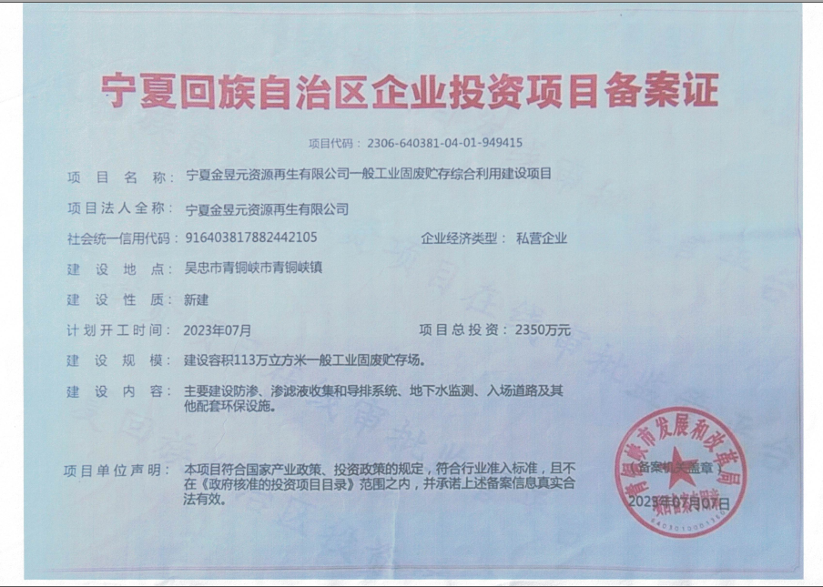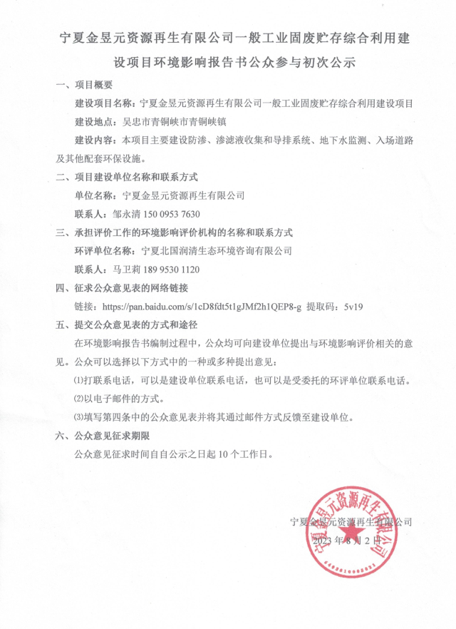 寧夏金昱元資源再生有限公司一般工業(yè)固廢貯存綜合利用建設(shè)項(xiàng)目環(huán)境影響報(bào)告書公眾參與初次公示